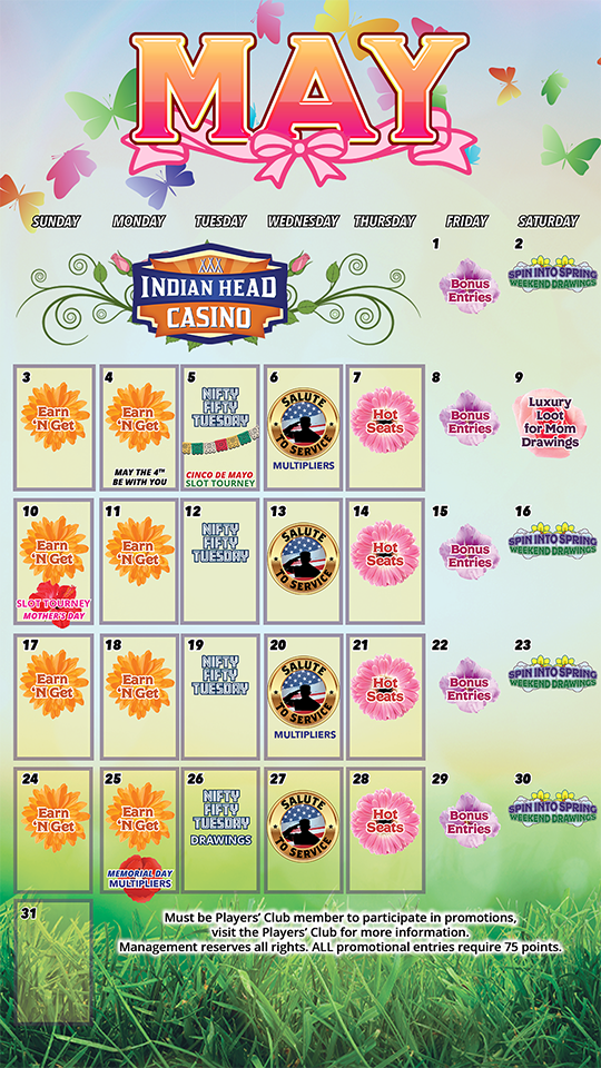 NIFTY FIFTY TUESDAYS Up to $35 Bonus Slot Play! The more you play, the more we pay! MUST BE 50 YEARS OR BETTER FOR ALL NIFTY FIFTY PROMOS. SALUTE TO SERVICE WEDNESDAYS Swipe at Kiosk for rewards every Wednesday. Military and Veterans ONLY. Proof of service required for ALL Salute to Service promos.
